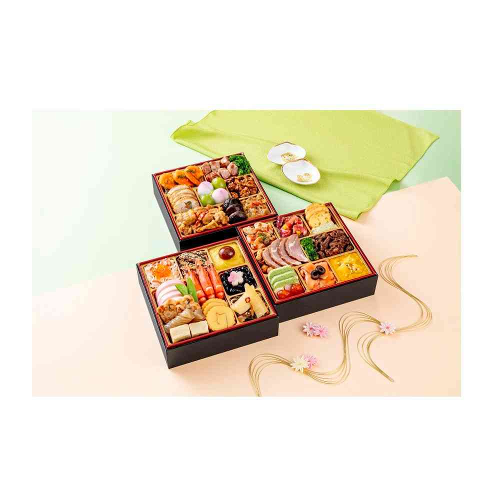 和の段は定番のおせち、洋の段はお酒との相性も〇、中華のエビチリや甘味はお子様にも人気です。