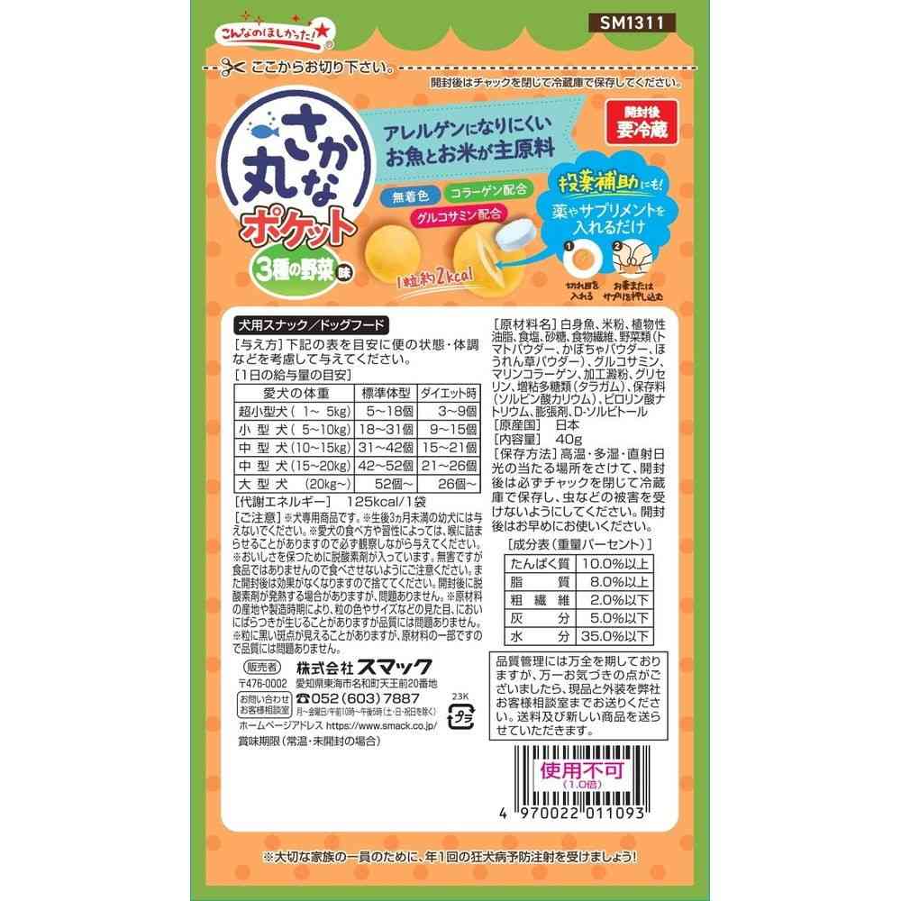 白身魚、米粉、植物性油脂、食塩、砂糖、食物繊維、野菜類(トマトパウダー、かぼちゃパウダー、ほうれん草パウダー)、グルコサミン、マリンコラーゲン、加工澱粉、グリセリン、増粘多糖類(タラガム)、保存料(ソルビン酸カリウム)、ピロリン酸ナトリウム、膨張剤、D-ソルビトール/【たんぱく質】10.0%以上【脂質】8.0%以上【粗繊維】2.0%以下【灰分】5.0%以下【水分】35.0%以下