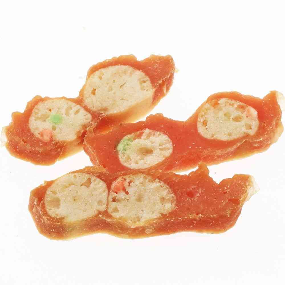 ●にんじんとほうれん草を加えた中央の白い生地には、カルシウムと軟骨ペーストを配合。骨の構成要素を意識して製造した商品です。