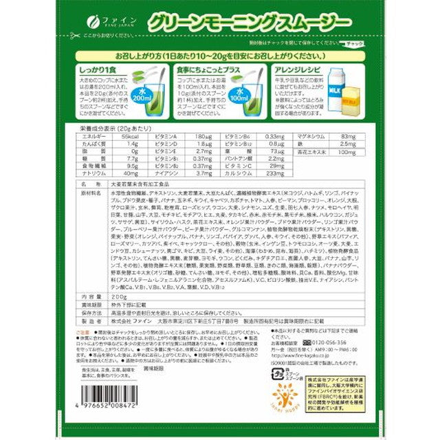 水溶性食物繊維、デキストリン、大麦若葉末、大豆たんぱく、濃縮植物酵素(米コウジ、ハトムギ、リンゴ、パイナップル、ブドウ果皮・種子、バナナ、玉ネギ、キウイ、キャベツ、カボチャ、トマト、人参、ピーマン、ブロッコリー、オレンジ、大根、ザクロ果汁、玄米、舞茸、乾椎茸、ローズヒップ、ウコン、大麦、シナモン、ユズ、生姜、田七人参、ナツメ、モロヘイヤ、明日葉、甘藷、山芋、大豆、モチキビ、モチアワ、ヒエ、丸麦、タカキビ、赤米、赤モチ米、黒モチ米、緑米、ハルウコン、ガジュツ、ササゲ、黒豆)、サイリウム・ハスク、茶花エキス末