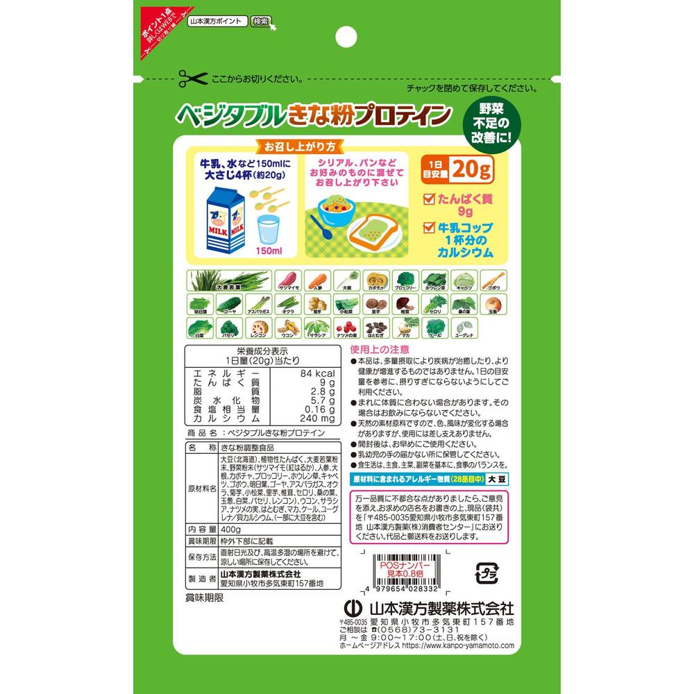 白大豆(北海道)、植物性たんぱく、大麦若葉粉末、野菜粉末(サツマイモ(紅はるか)、人参、大根、カボチャ、ブロッコリー、ホウレン草、キャベツ、ごぼう、明日葉、ゴーヤ、アスパラガス、オクラ、菊芋、小松菜、里芋、椎茸、セロリ、桑の葉、玉ねぎ、白菜、パセリ、レンコン)、ウコン、サラシア、ナツメの実、はとむぎ、マカ、ケール、ユーグレナ/貝カルシウム、(一部に大豆を含む)