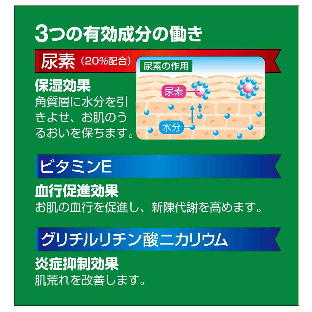100g中に次の成分を含みます 尿素 20g グリチルリチン酸二カリウム 0.5g トコフェロール酢酸エステル 0.5g