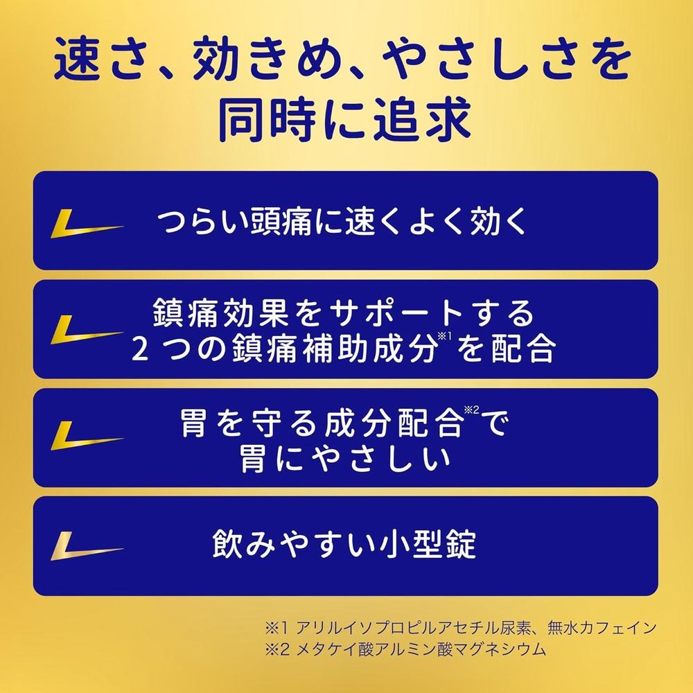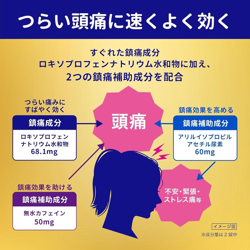 ●つらい痛みにすばやく効く鎮痛成分(ロキソプロフェンナトリウム水和物)に,アリルイソプロピルアセチル尿素を配合,鎮痛効果を高めます。