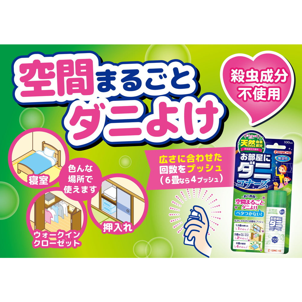天然由来成分の1プッシュ式ダニよけスプレー。ダニが嫌がる成分で約1週間、空間まるごとダニを寄せ付けません。殺虫成分は不使用。無臭性。100回用。
