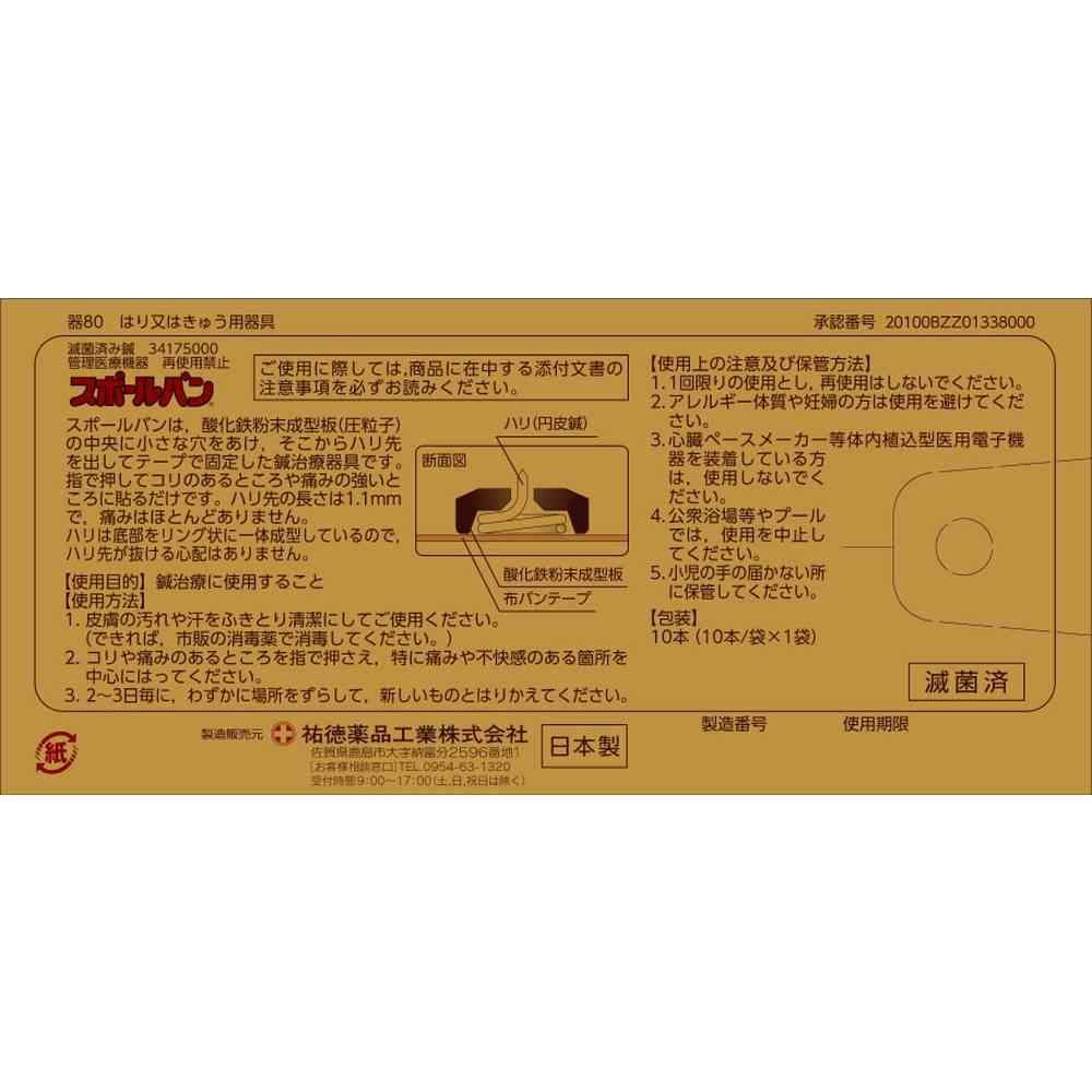 スポールバンは酸化鉄粉末成型板(圧粒子)の中央に小さな穴をあけ、そこからハリ先を出してテープで固定した鍼用器具です。