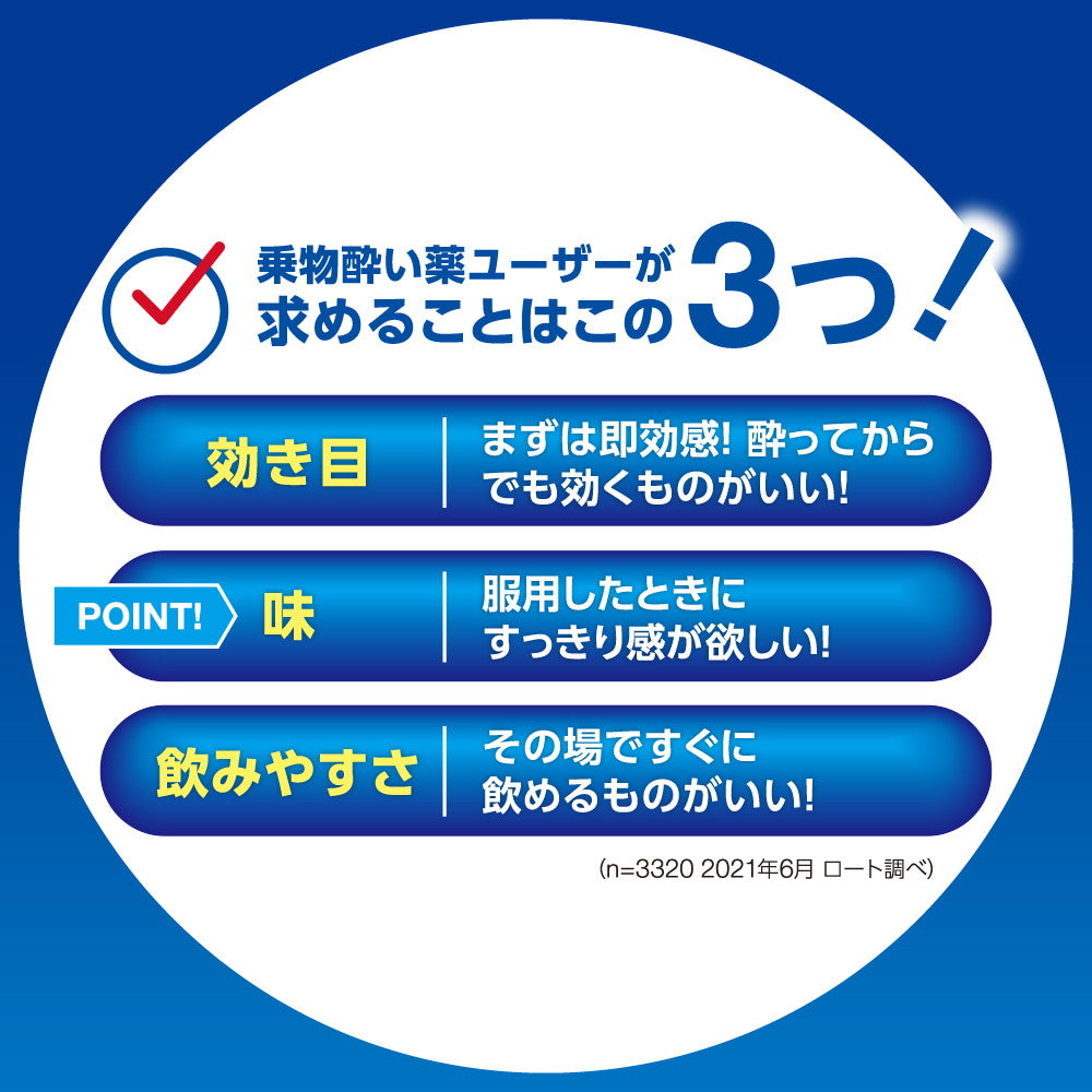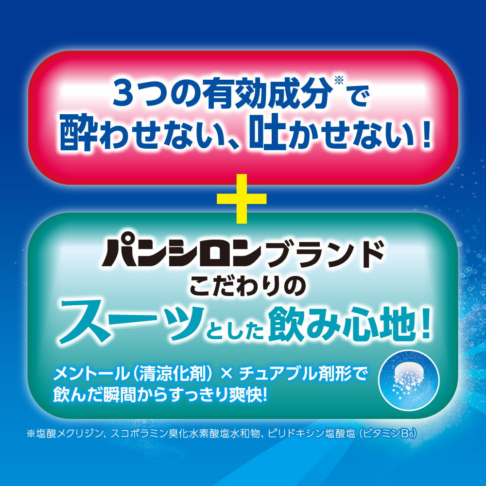 本剤はチュアブル錠ですので、下記の量を乗物酔いの予防には乗車船30分前、あるいは乗物に酔ったときにかむか、口中で溶かして服用してください。
