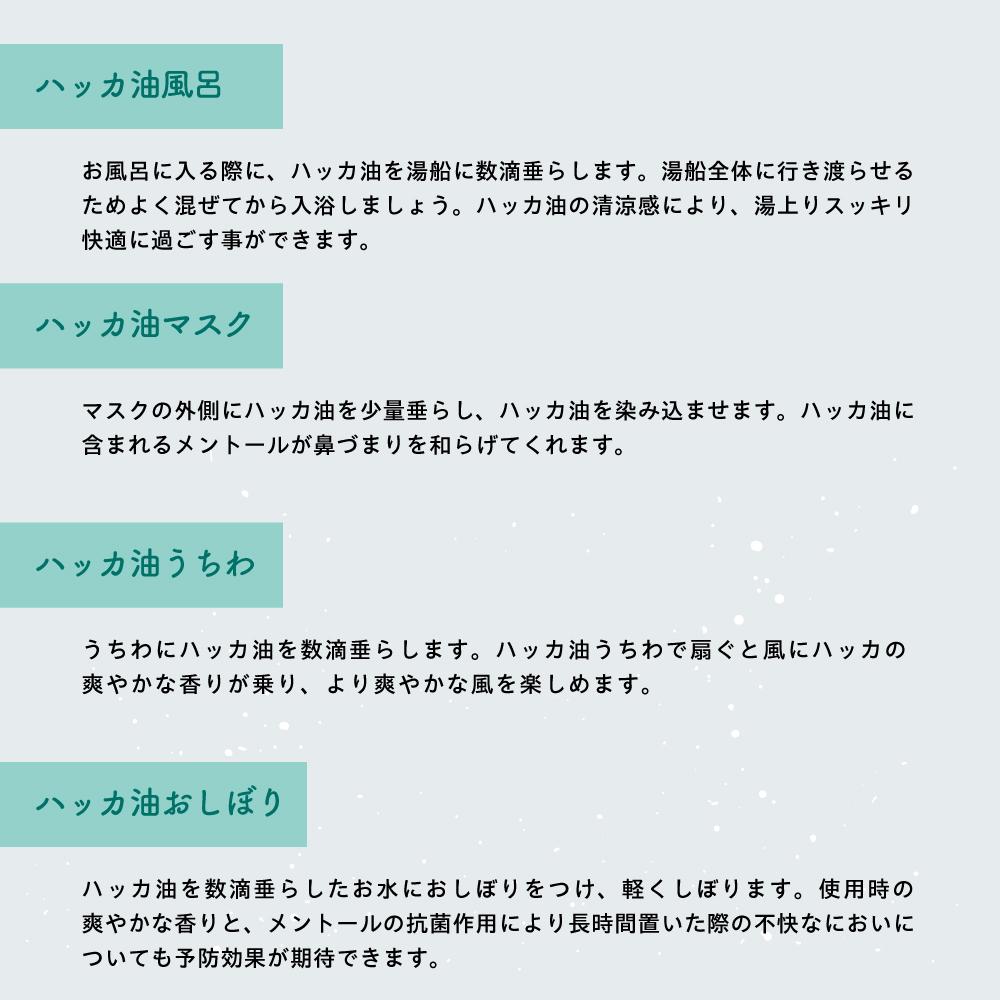 ●紅茶やリキュール等の香りづけに(ようじの先がぬれた程度でお試しください。)●お風呂に●虫よけに●お部屋の芳香、アロマテラピーに (用途に応じて薄めるなどしてご使用ください。なお、入れすぎや使いすぎにはご注意ください。)