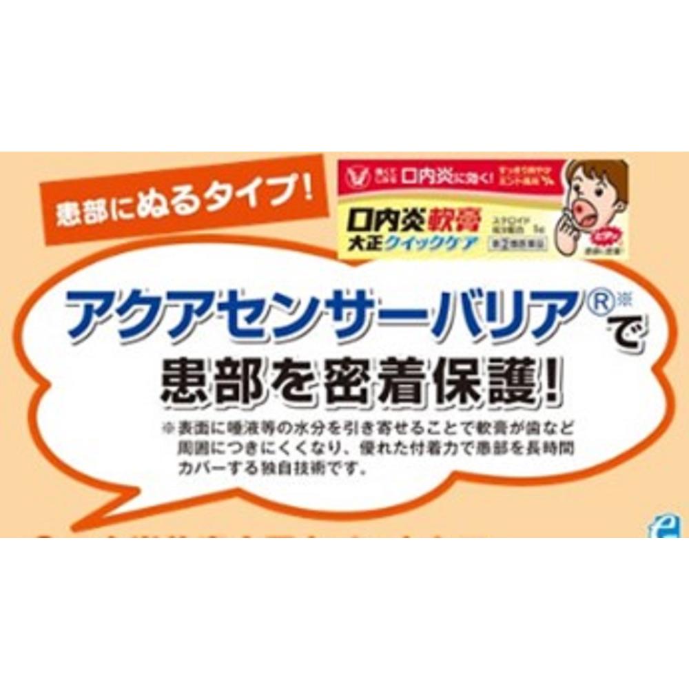 ◆口内炎軟膏大正クイックケアは,口内炎の治療を目的として開発した軟膏です。患部への密着性が良く,口腔内であっても長時間患部を覆います。