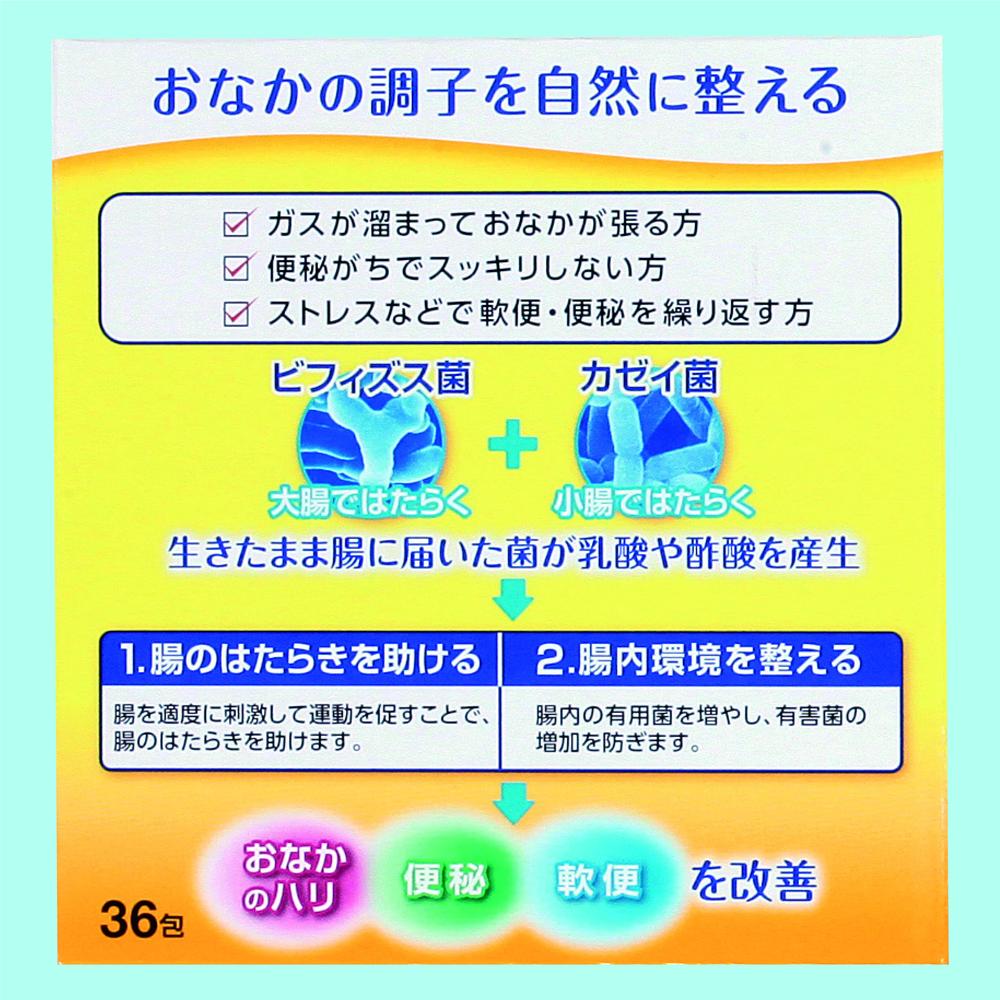 1.ビフィズス菌とカゼイ菌(乳酸菌)が、1包中にあわせて約70億個も生きています。2.消化液に強い2種類の菌が、生きたまま腸内に届きます。3.腸の運動を活発にして便秘を改善します。4.ビフィズス菌は大腸で、カゼイ菌(乳酸菌)は小腸で、おなかの中の広い範囲で、整腸効果を高めます。5.乳幼児(3か月以上)にも飲みやすい少し甘みある散剤です。6.携帯・服用に便利なステイック分包です。