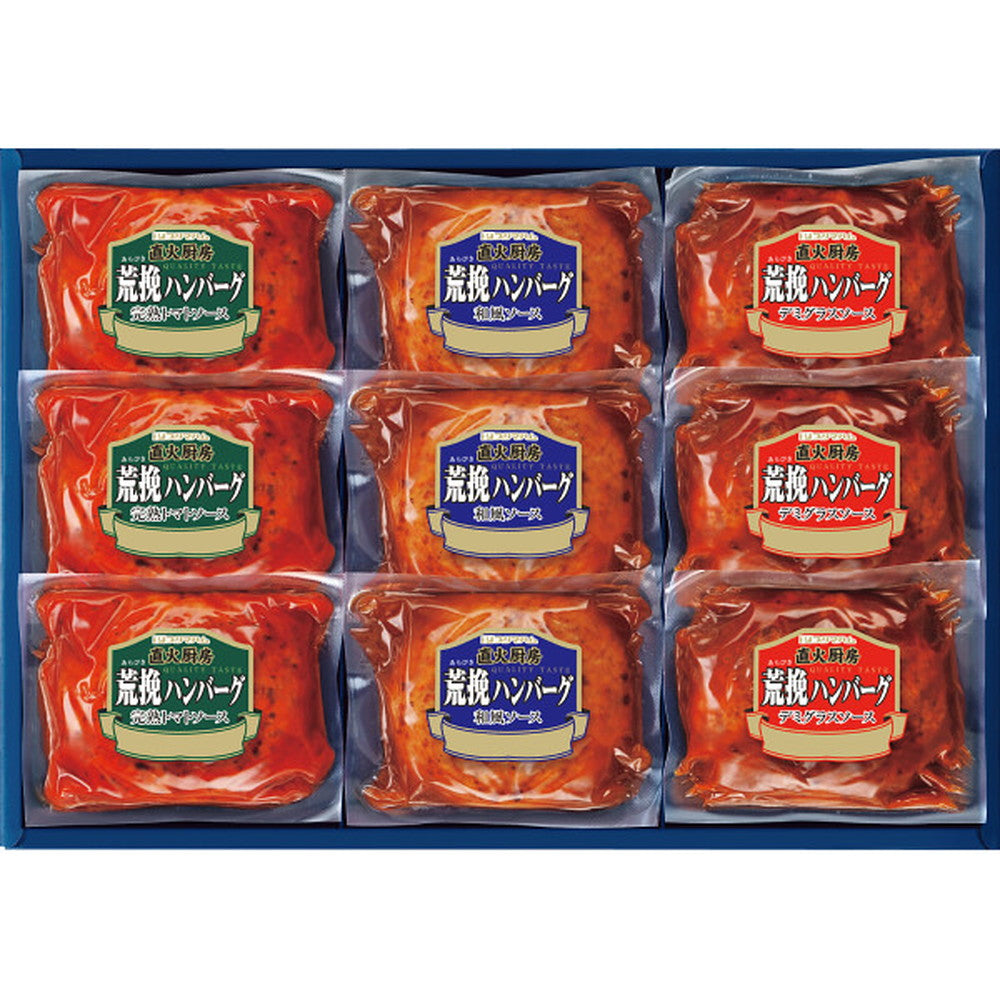 商品内容:●荒挽ハンバーグ(豚肉・牛肉使用)(完熟トマトソース・和風ソース・デミグラスソース各120g×各3)