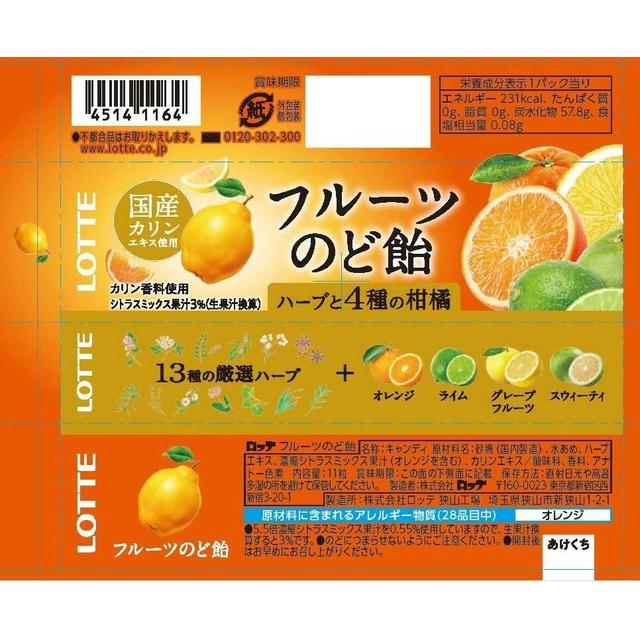 砂糖(国内製造)、水あめ、ハーブエキス、濃縮シトラスミックス果汁(オレンジを含む)、カリンエキス/酸味料、香料、アナトー色素