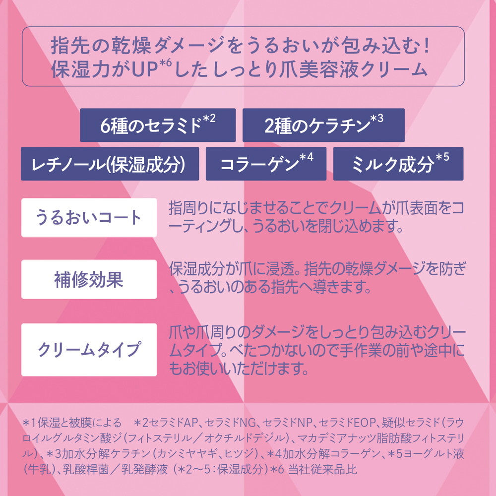 ●6種のセラミドを新配合。指周りになじませることでクリームが爪表面をコーティング。