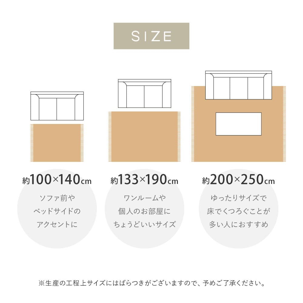 ヒートセット加工により、なめらかな触感と遊び毛の出にくさにも配慮。ホットカーペット・床暖房対応で、季節を問わず一年を通して使用できます。落ち着いたデザインはワンルームからリビングまで取り入れやすく、ソファ前やベッドサイドなど、日常のさまざまなシーンで活躍するウィルトンラグです。