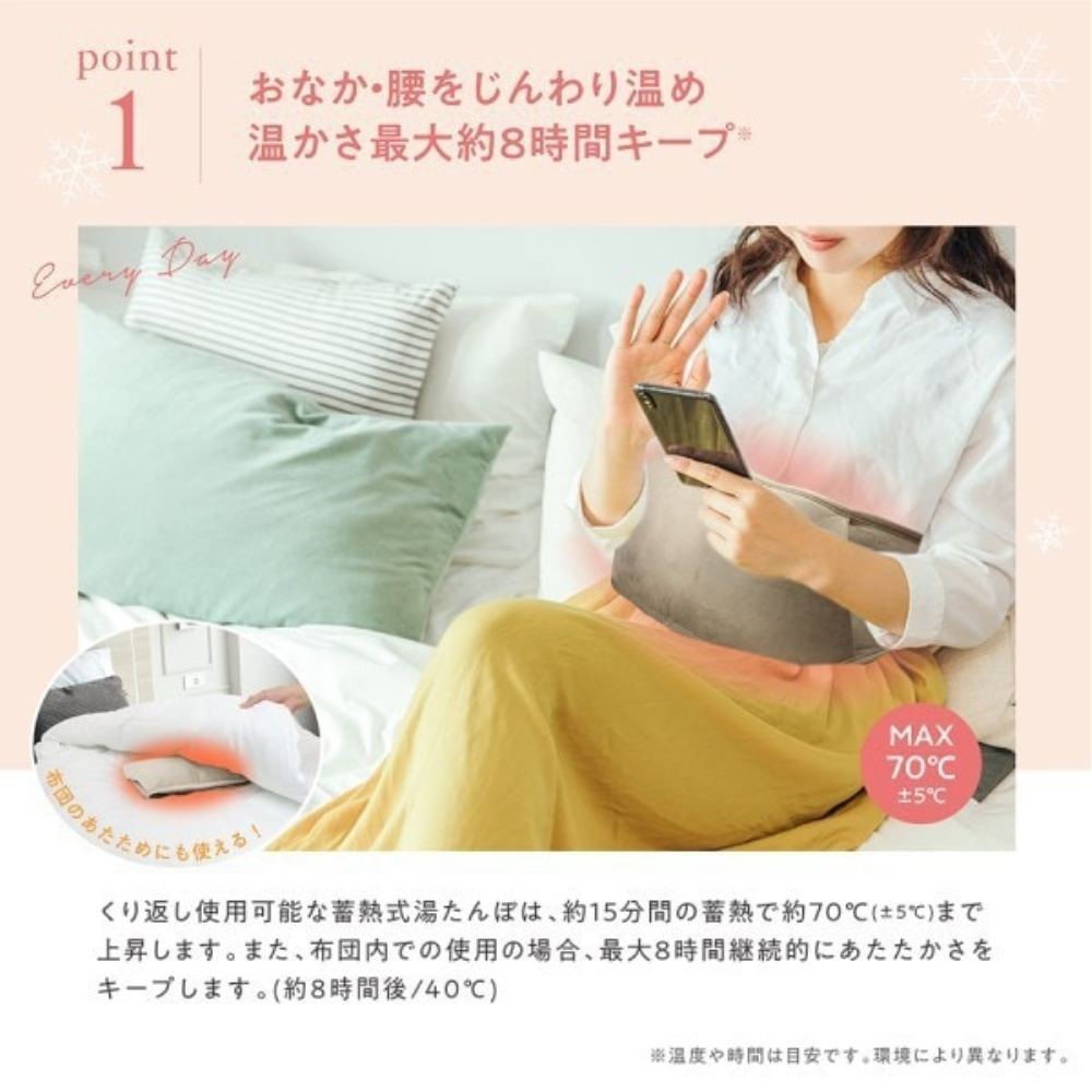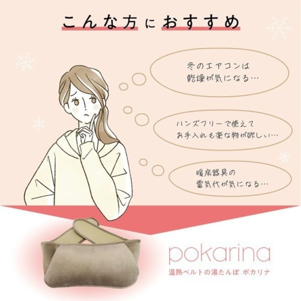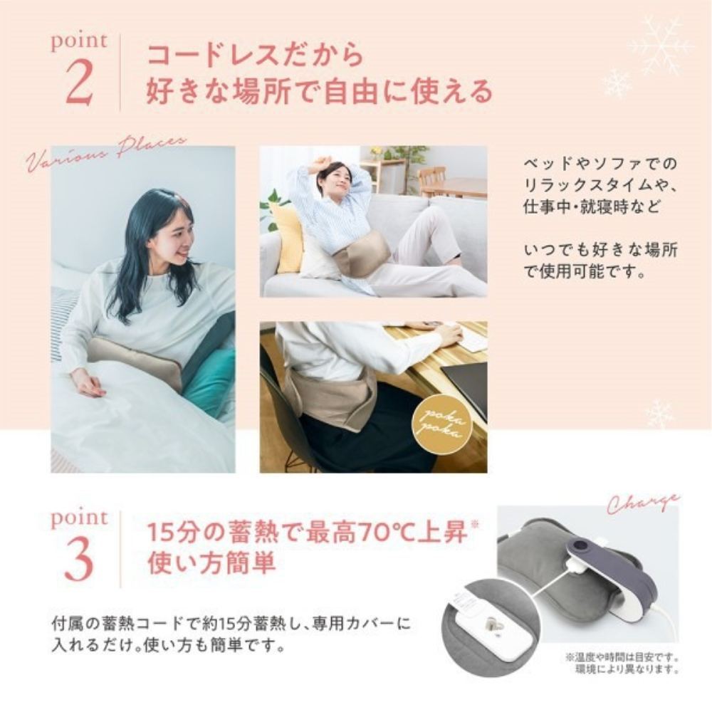 やわらかい温熱が大切なおなか・腰を深く温めます。水の交換が必要なく繰り返し使えるAC蓄熱式湯たんぽ「ポカリナ」温かさはMAX約70C。お腹・腰をじんわりあたためます。冬場のふとんの温めにも使えます。専用カバーはとろけるような触り心地の起毛素材。コードレスだから好きな場所で自由に使えます。洗濯OKです。フリーサイズ男女兼用。