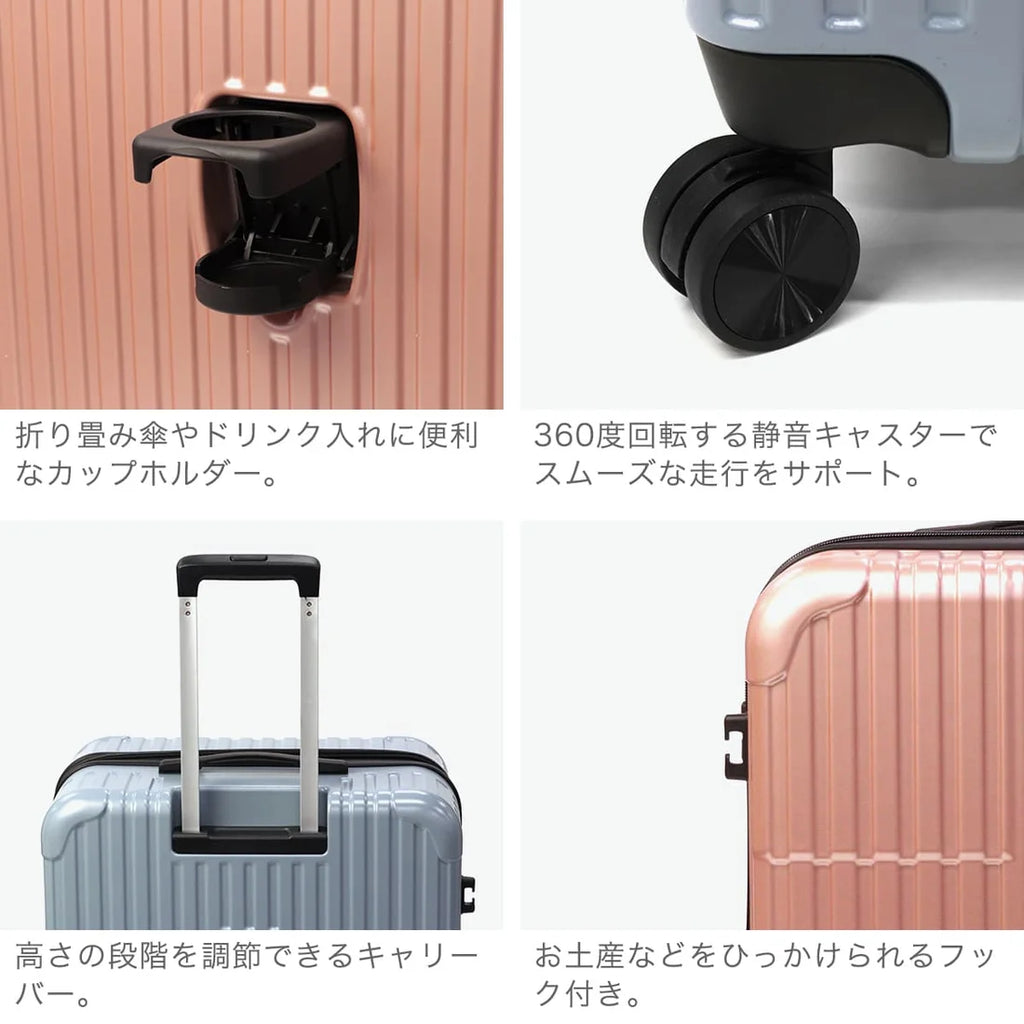 人気北欧ブランド「SCANDINAVIAN FOREST」からスーツケースが登場!100Lから105Lに拡張でき、長期旅行も余裕の収納力を持つLサイズのスーツケース。静音ダブルキャスターでスムーズな移動をサポートします。外側にはドリンクホルダーやフック機能も搭載し、使いやすさ抜群!シンプルでおしゃれな北欧デザインが旅を彩ります。使いやすい機能満載!キャスターは360度回転し、便利なストッパー機能も付いています。 お土産などを引掛けられるサイドフックやカップホルダー付き!●重量 (約):4.6kg●容量 (約):100/105L●旅行日数の目安:10泊程度●TSAロック:あり●仕様:ポケット×2