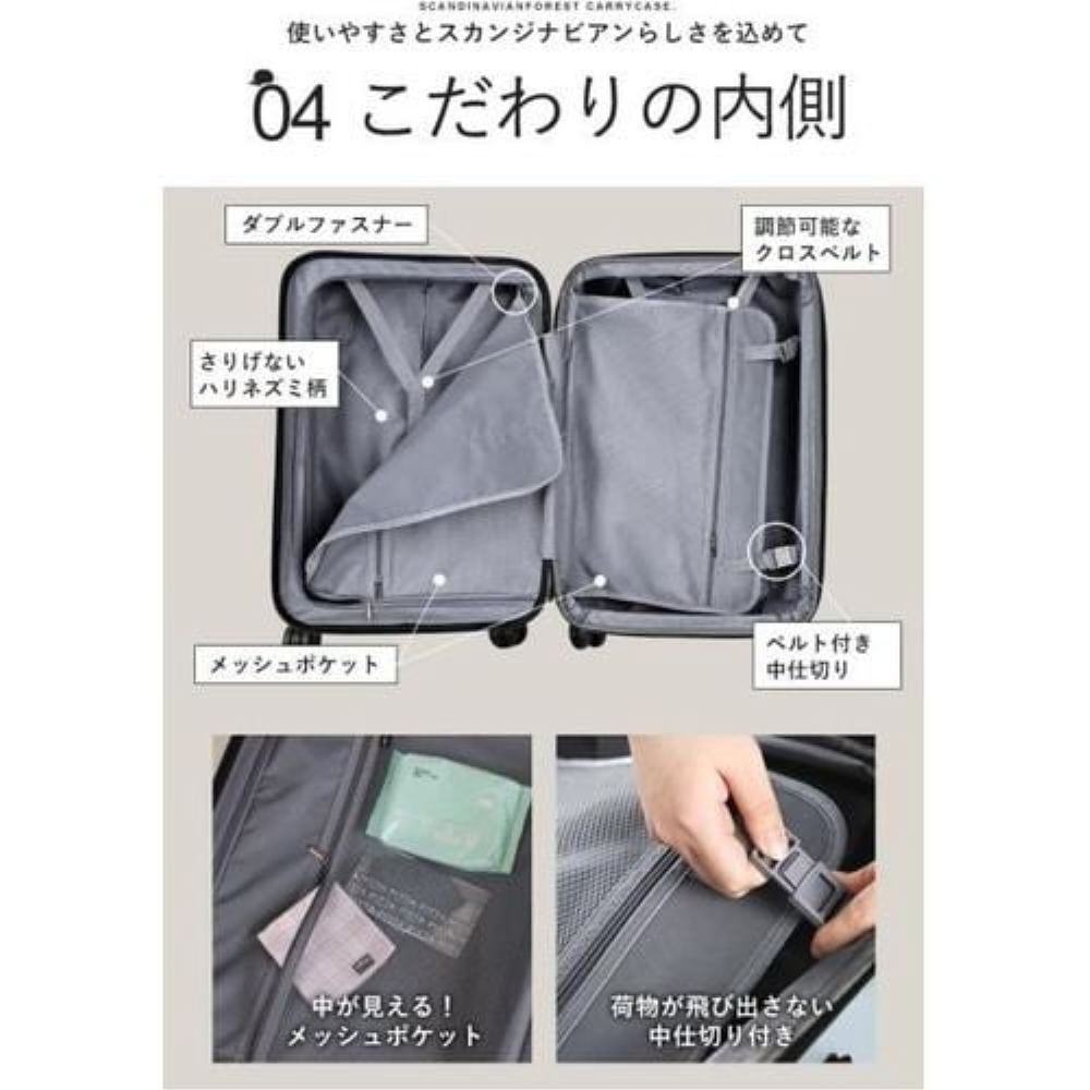 人気北欧ブランド「SCANDINAVIAN FOREST」からスーツケースが登場!100Lから105Lに拡張でき、長期旅行も余裕の収納力を持つLサイズのスーツケース。静音ダブルキャスターでスムーズな移動をサポートします。外側にはドリンクホルダーやフック機能も搭載し、使いやすさ抜群!シンプルでおしゃれな北欧デザインが旅を彩ります。使いやすい機能満載!キャスターは360度回転し、便利なストッパー機能も付いています。 お土産などを引掛けられるサイドフックやカップホルダー付き!●重量 (約):4.6kg●容量 (約):100/105L●旅行日数の目安:10泊程度●TSAロック:あり●仕様:ポケット×2