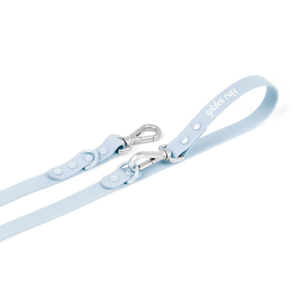 雨の日や水遊びで汚れても大丈夫なウォータープルーフ(防水)! ●防水素材のソフトPVCを使用しており、耐久性と柔軟性にも優れています。●サッと水洗いして拭き取るだけでカンタンに汚れが取れるから、雨の日でも水濡れや泥汚れを気にせずにお散歩できます。●水遊びや海や川などのアウトドアでも活躍します。●余計な装飾がなくシンプルなデザインで、装着もカンタン。【細部にこだわったデザイン】ストラップ部分には特殊なパウダー加工を施しており、マットですべすべの手ざわりが心地いい。フック(ナスカン)はツヤ消し加工、Dリングはストラップと同色のものを使用。さらにブランドのロゴはシルク加工で仕上げるなど、細部までこだわって作られています。【ハンズフリーリードとしても】フック(ナスカン)の留める位置を変えると長さが調整できるので、ハンズフリーリードとしても利用可能です。【お手入れ方法】汚れが気になるときは、せっけんとぬるま湯で手洗いしてください。ソフトPVCで作られた、オーストラリア発のシンプルな犬用リード。耐久性が高く、防水素材なので雨の日や水遊び、アウトドアで重宝します。