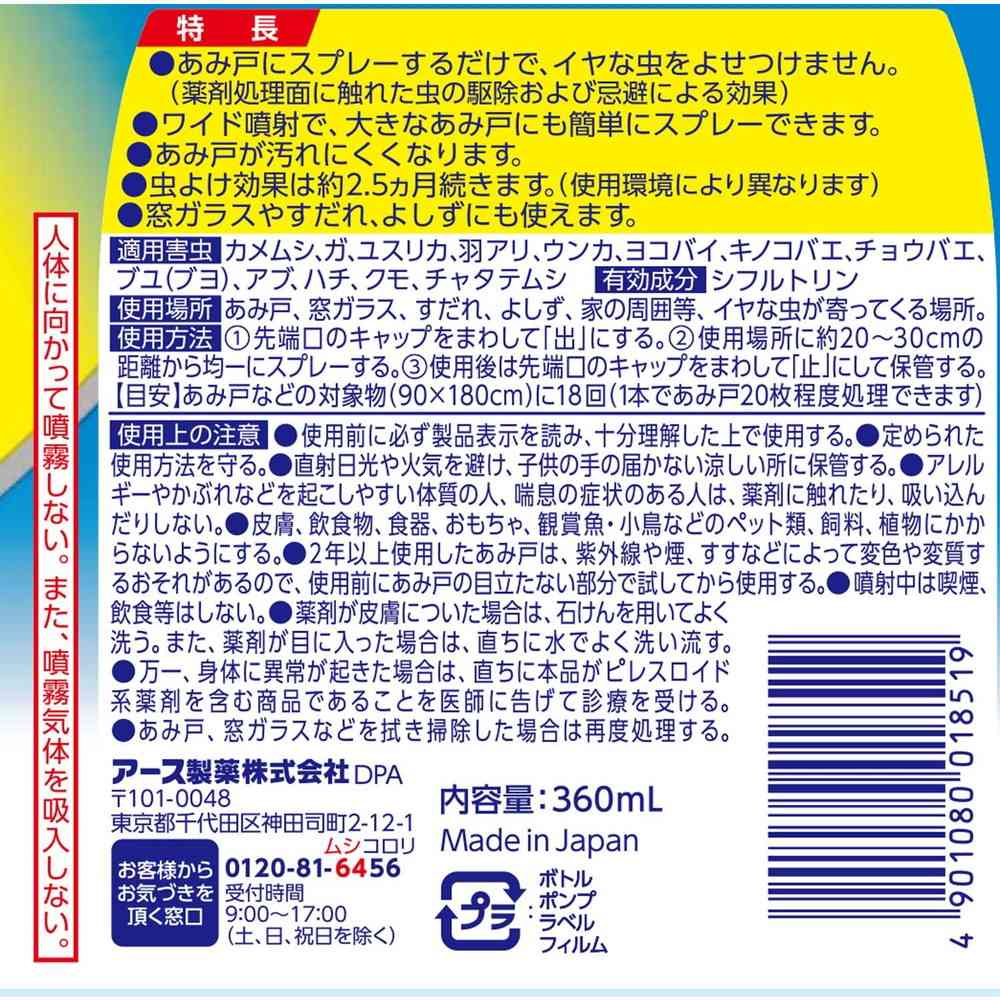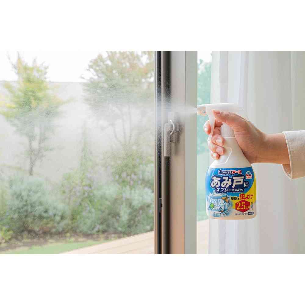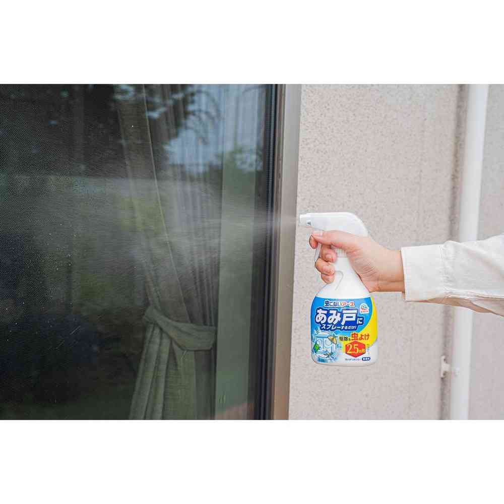 スプレーするだけで、害虫の侵入を約2.5ヵ月間防ぎます、雨にも強く、あみ戸汚れも防ぎます。あみ戸約20枚を処理できます。害虫に直接スプレーして殺虫もできます。