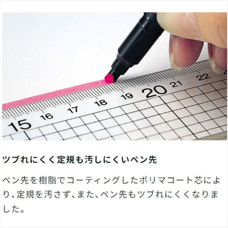 ●ペン先が強くツブれない、定規が汚れない、ポリマコート芯の水性蛍光マーカー