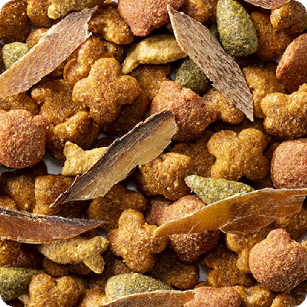 たんぱく質28.5%以上、脂質9.0%以上、粗繊維4.5%以下、灰分9.0%以下、水分10.0%以下、カルシウム0.9%以上、リン0.8%以上、マグネシウム標準値0.12%