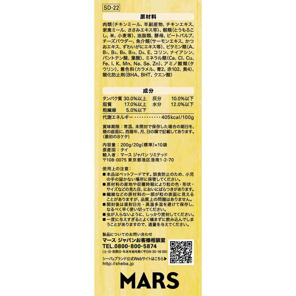 肉類(チキンミール、羊副産物、チキンエキス、家禽ミール、ささみエキス等)、穀類(とうもろこし、米、小麦等)、油脂類、酵母、ビートパルプ、チーズパウダー、魚介類(サーモンエキス、かつおエキス、ずわいがにエキス等)、ビタミン類(A、B1、B2、B6、B12、D3、E、コリン、ナイアシン、パントテン酸、葉酸)、ミネラル類(Ca、Cl、Cu、Fe、I、K、Mn、Na、Se、Zn)、アミノ酸類(タウリン)、着色料(カラメル、青2、赤102、黄4)、酸化防止剤(BHA、BHT、クエン酸)