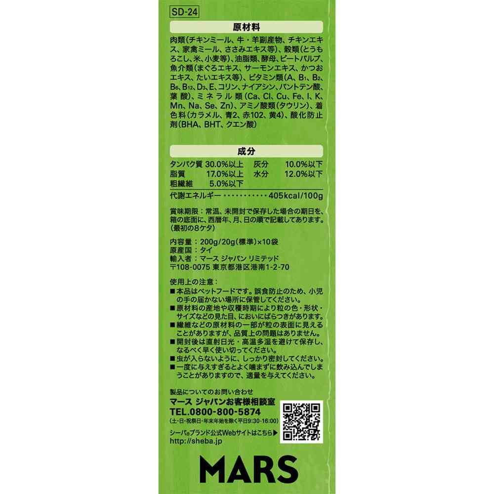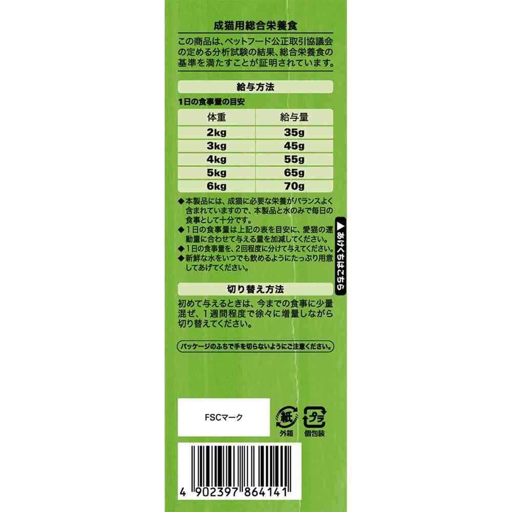 肉類(チキンミール、牛・羊副産物、チキンエキス、家禽ミール、ささみエキス等)、穀類(とうもろこし、米、小麦等)、油脂類、酵母、ビートパルプ、魚介類(まぐろエキス、サーモンエキス、かつおエキス、たいエキス等)、ビタミン類(A、B1、B2、B6、B12、D3、E、コリン、ナイアシン、パントテン酸、葉酸)、ミネラル類(Ca、Cl、Cu、Fe、I、K、Mn、Na、Se、Zn)、アミノ酸類(タウリン)、着色料(カラメル、青2、赤102、黄4)、酸化防止剤(BHA、BHT、クエン酸)