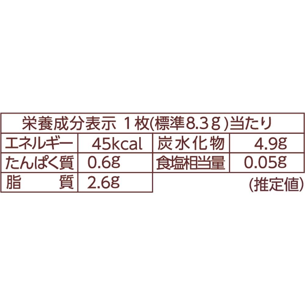 その他1枚(標準8.3g)当たり熱量45(kcal) たんぱく質0.6(g) 脂質2.6(g) 炭水化物4.9(g) 食塩相当量0.05(g) ナトリウム‐(mg)