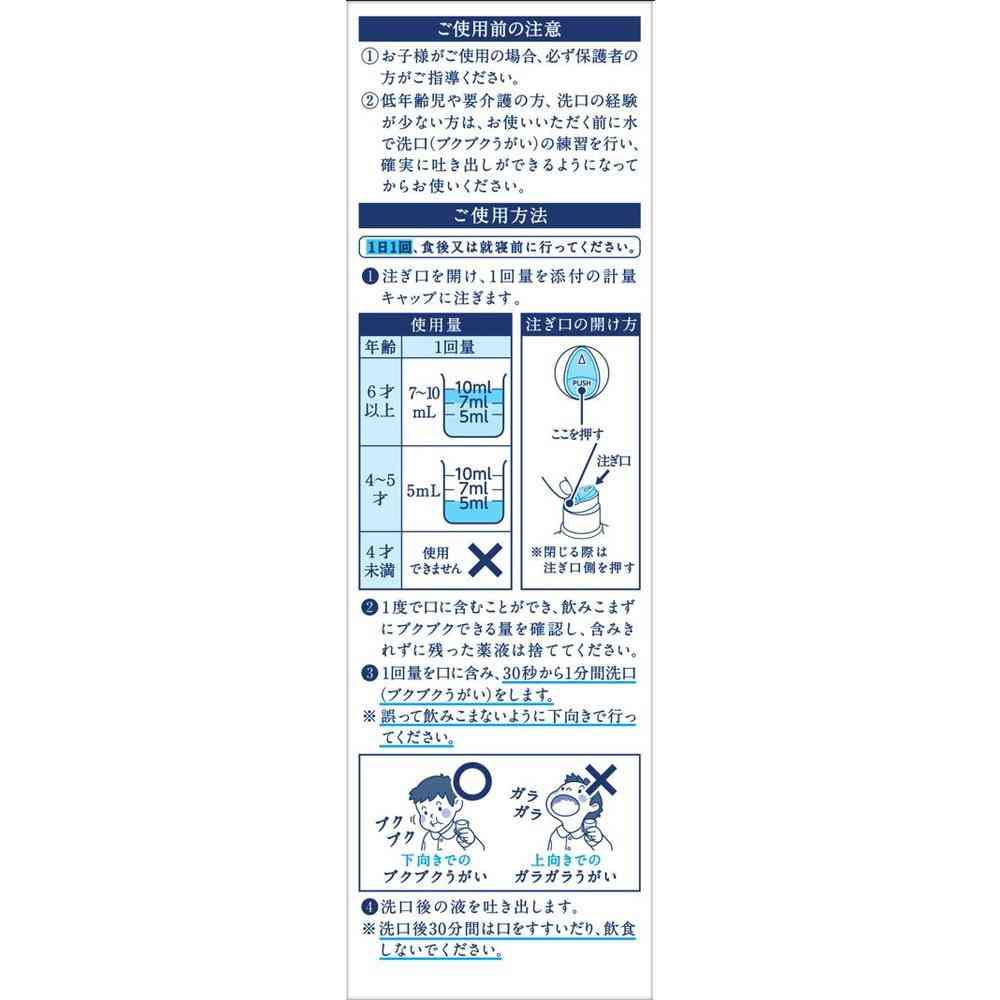(5)低年齢児や要介護の方、洗口の経験の少ない方は、水で洗口(ブクブクうがい)の練習を行い、確実に吐き出せることを確認してからご使用ください。