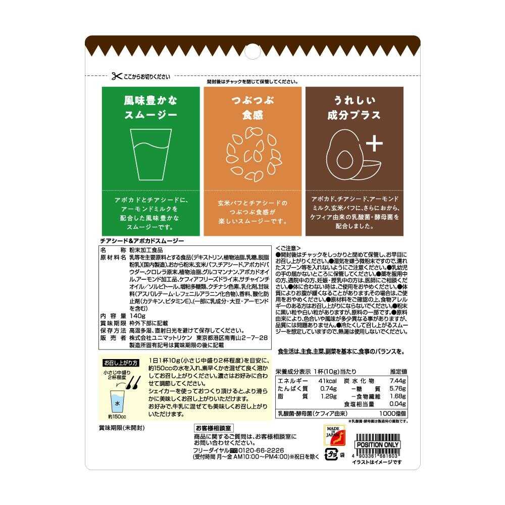 満足感をサポートしてくれる「チアシード」、若々しさをサポートする「アボカド」「アーモンドミルク」を配合したスムージーです。