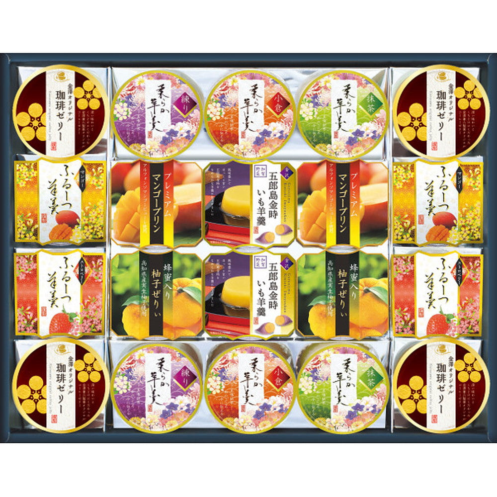 商品内容:●五郎島金時いも羊羹80g・プレミアムマンゴープリン75g・蜂蜜入り柚子ぜりぃ75g・柔らか羊羹抹茶60g・柔らか羊羹小倉60g・柔らか羊羹練り60g・ふるーつ羊羹ストロベリー60g・ふるーつ羊羹マンゴー60g×各2、金澤オリジナル珈琲ゼリー52g×4