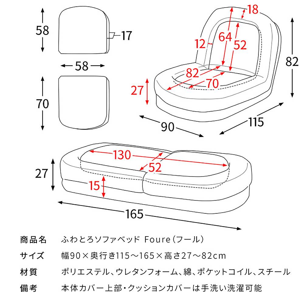 座椅子・ソファ・ベッドの3wayでお使いいただけて一日中過ごせる巣ごもりふわとろソファベッド『Foure(フール)』。とろけるような肌触りが気持ち良いマイクロファイバー生地とふかふかクッションがあなたを癒してくれます。18段階フリーロックリクライニングでお好みの角度に調整可能。カバーはふわとろ生地がホワイト、ベージュ、ピンク、グレー、ダークグレーの5種類、ブークレ生地がホワイト、グレーの2種類、ふわとろストライプがオフホワイト、グレー、グレージュの3種類あり、お部屋の雰囲気やお好みでお選びいただけます。 製品重量:14.5kg