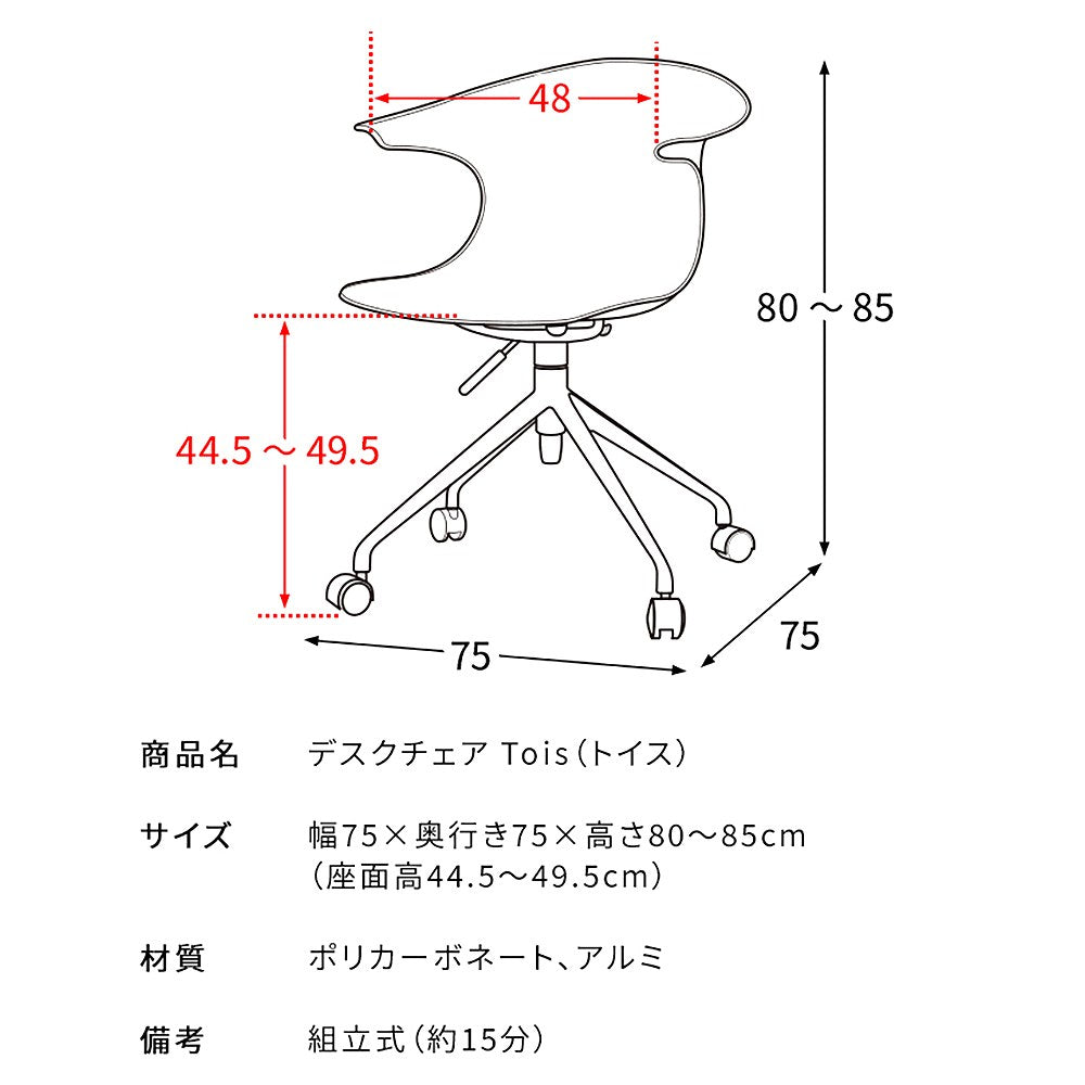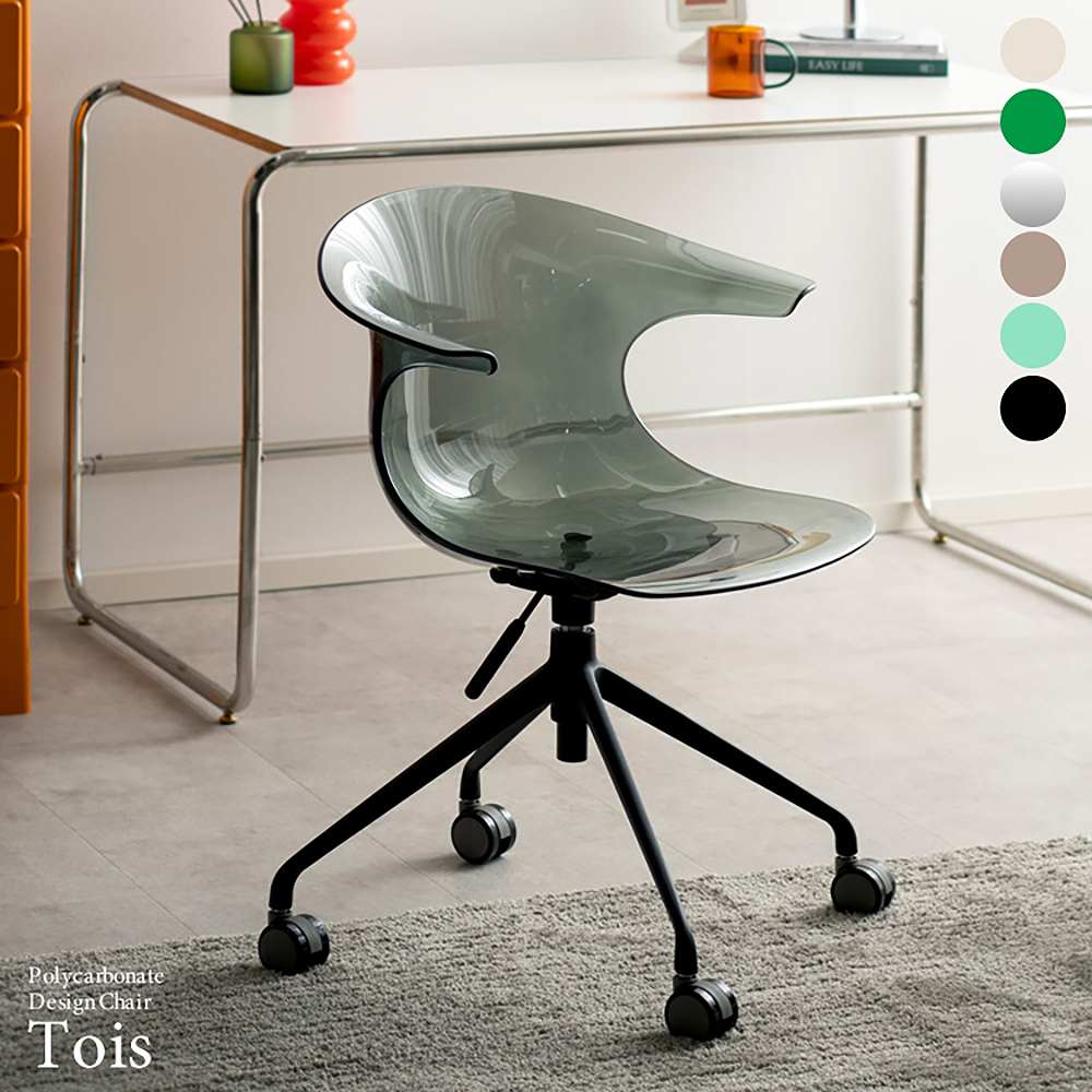 身体にフィットする美しい曲線座面のデザインチェア『Tois(トイス)』。強度の高いポリカーボネート製の座面は背もたれ一体型でゆとりをもってお座りいただけます。不透明で白脚のクリーム、グリーン、透明で黒脚のクリア、ライトグリーン、アンバー、ブラックの6カラーをご用意。お好みでお選びいただけます。製品重量:7.7kg