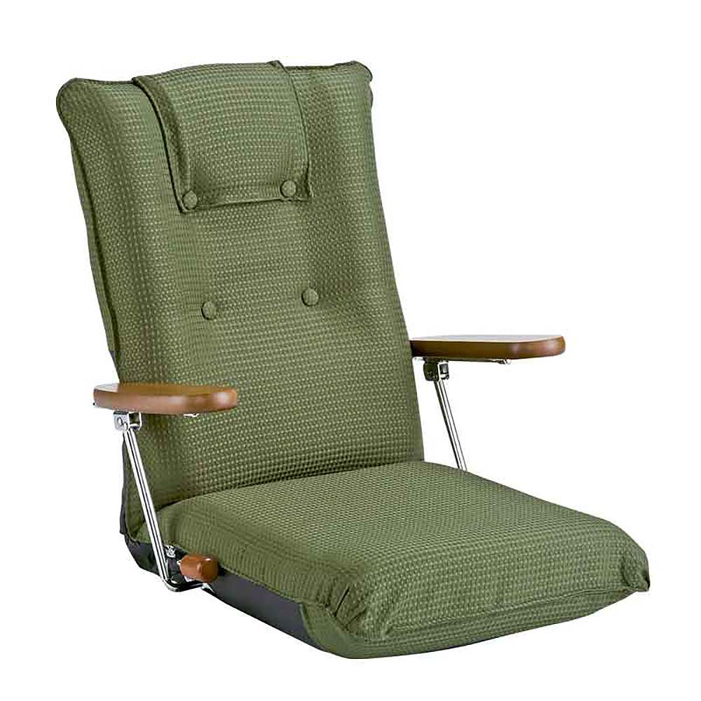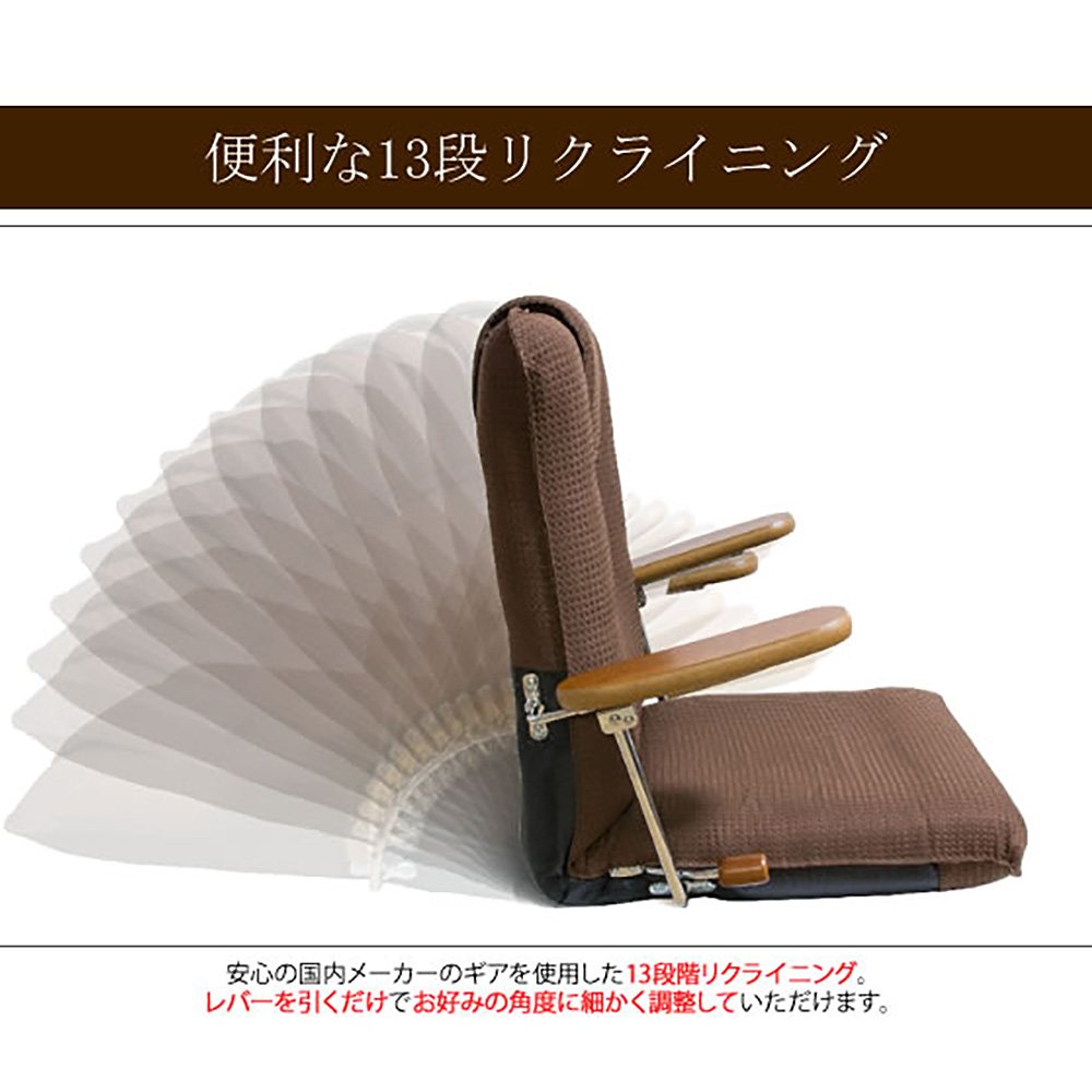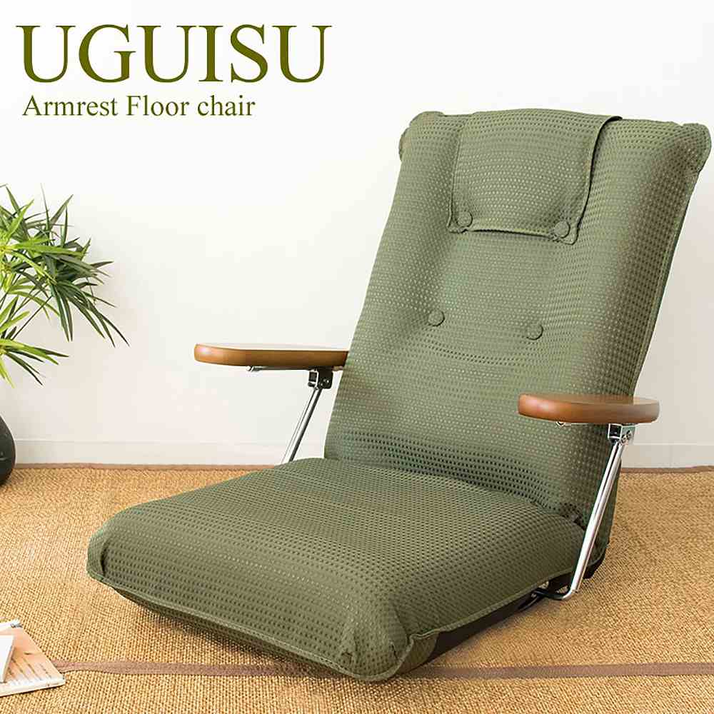 簡単に跳ね上がるポンプ式の肘置きがついた、落ち着きのあるベーシックな日本製座椅子『UGUISU(うぐいす)』。