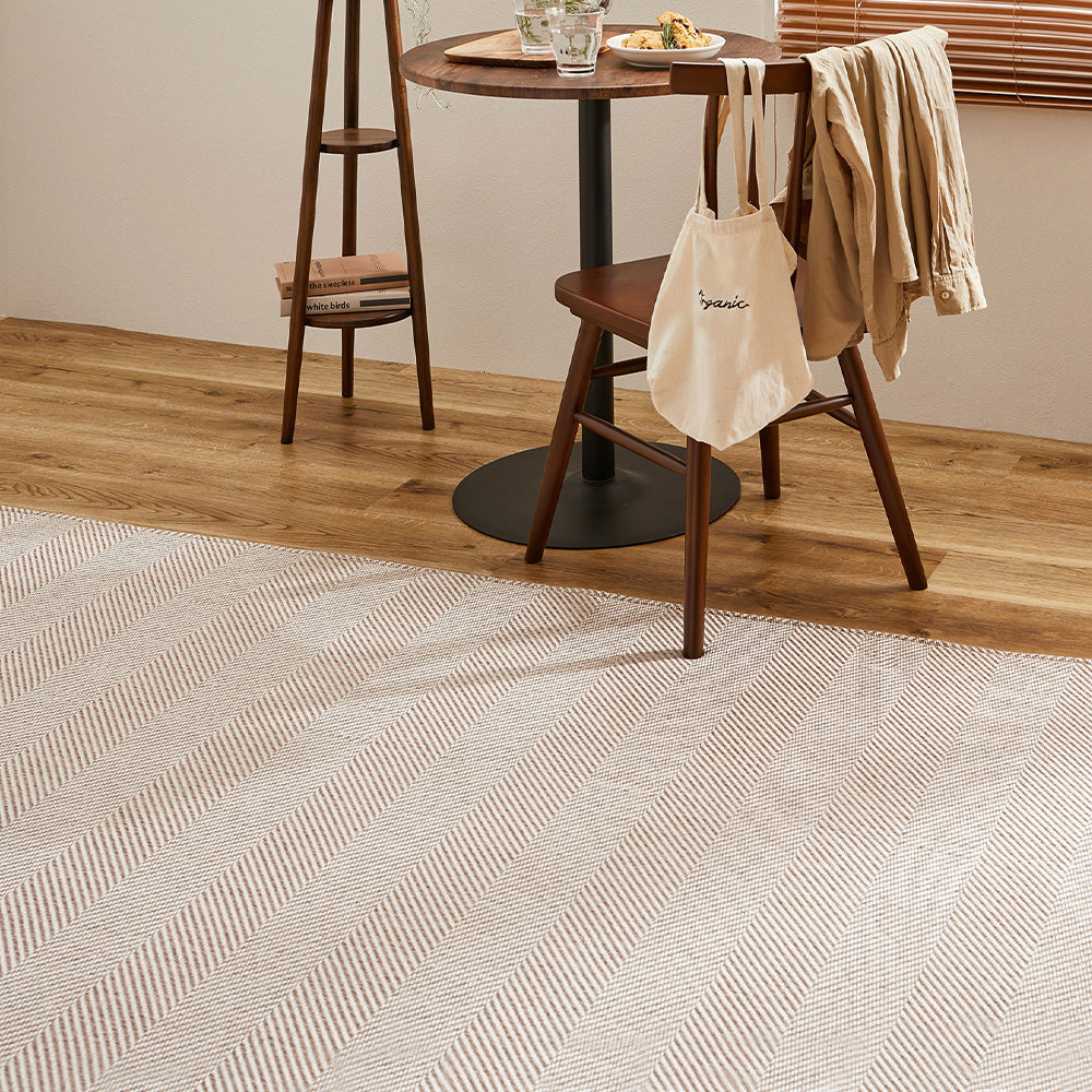 5色から選べるジャガード生地のナチュラルラグ。オールシーズン対応で、すべり止めも付いていて、洗濯機で洗える。機能面もバッチリ。糸の組み合わせ方にこだわりました。