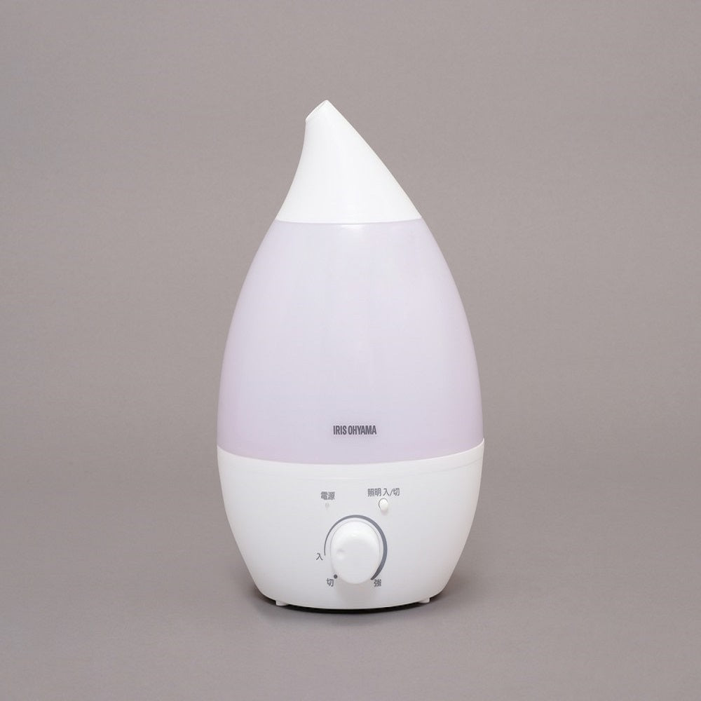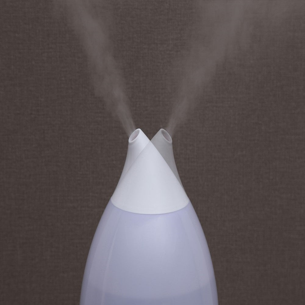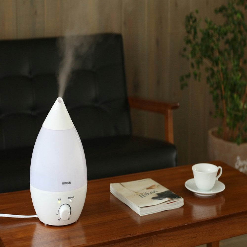 コンパクトなドロップ型で、インテリアにもマッチする超音波式加湿器です。お部屋の乾燥具合に合わせて、ダイヤルを回して加湿量を無段階で調節できます。ミストの吹出しは360°調節可能です。スイッチを押すたびに7色に光るLED搭載。気分に合わせてカラーを変更できます。抗菌ビーズ「Ag+抗菌」でタンク内の水を清潔に保ちます。