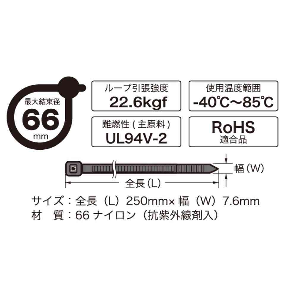 サイズ: サイズ:全長250mm×幅7.6mm 最大結束径:66mm