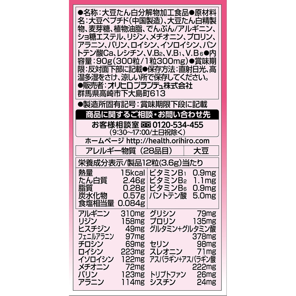 大豆ペプチド(中国製造)、大豆たん白精製物、麦芽糖、植物油脂、でんぷん/アルギニン、ショ糖エステル、リジン、メチオニン、プロリン、アラニン、バリン、ロイシン、イソロイシン、パントテン酸Ca、レシチン、V.B2、V.B1、V.B6