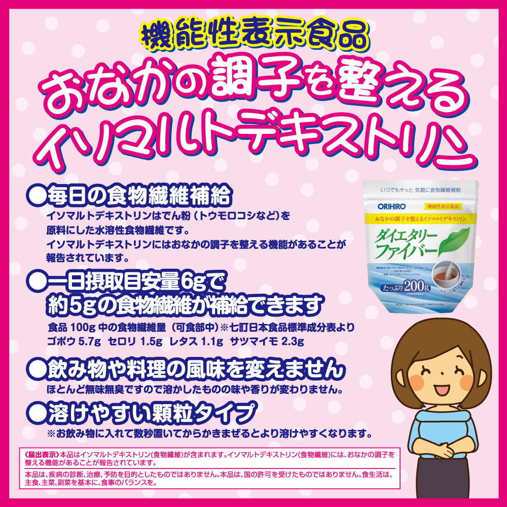 本品にはイソマルトデキストリン(食物繊維)が含まれます。イソマルトデキストリン(食物繊維)には、おなかの調子を整える機能があることが報告されています。