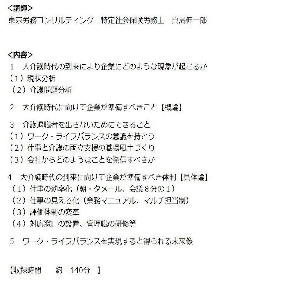 セミナー形式でわかりやすく解説! 大介護時代に突入した時に、企業にどのようなことが起こるのか、また、それに加え、どのような対策や準備が必要となるのかをわかりやすく解説しているDVDです。