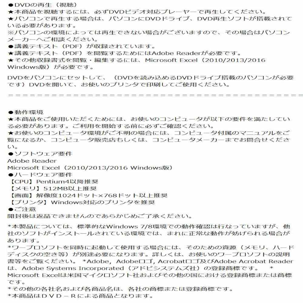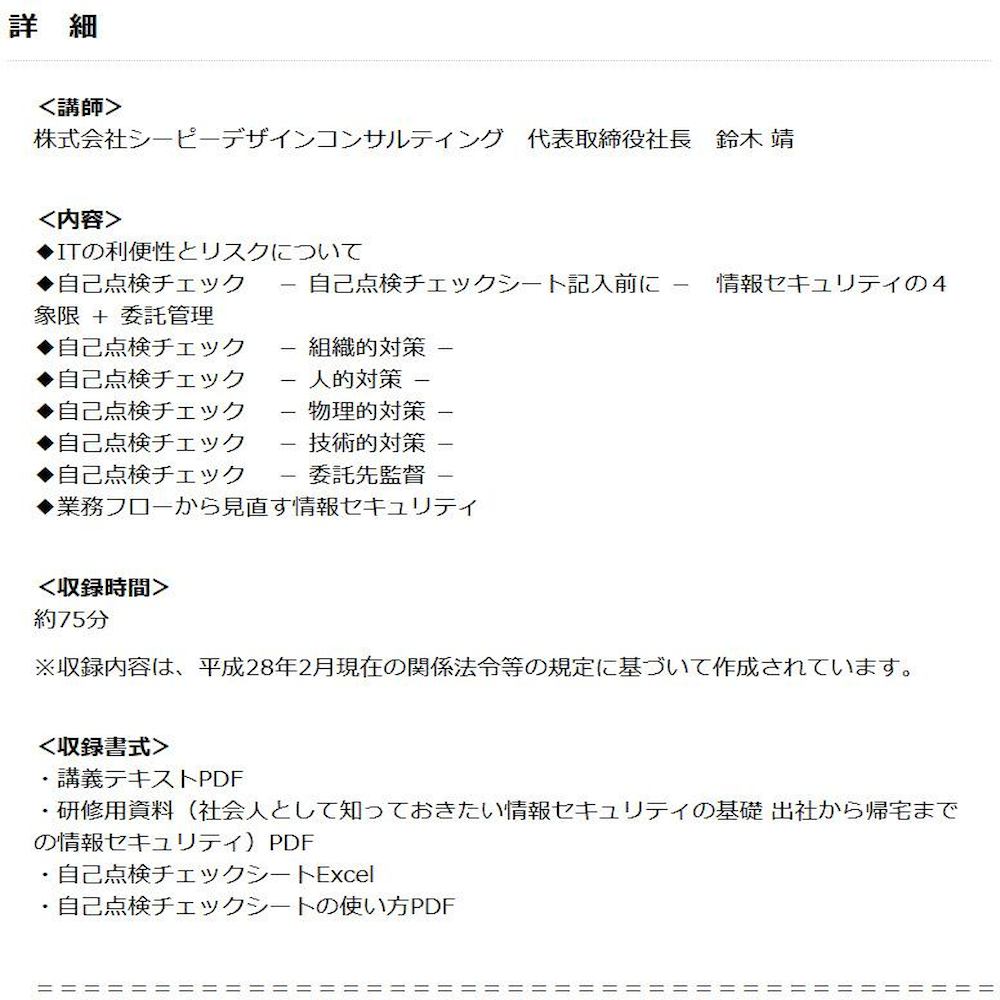 講義映像とテキスト(PDF)をセット! 本DVDは、これからスタートする中小規模事業者でも安心して、自己点検チェックシート(Excel)を使って、自社の情報セキュリティ対策が点検でき、何が現状足りていないか、必要な対策は何かを正確に把握して、最低限の組織的対策・人的対策・物理的対策・技術的対策・委託先監督の安全管理措置を解説したDVDです。