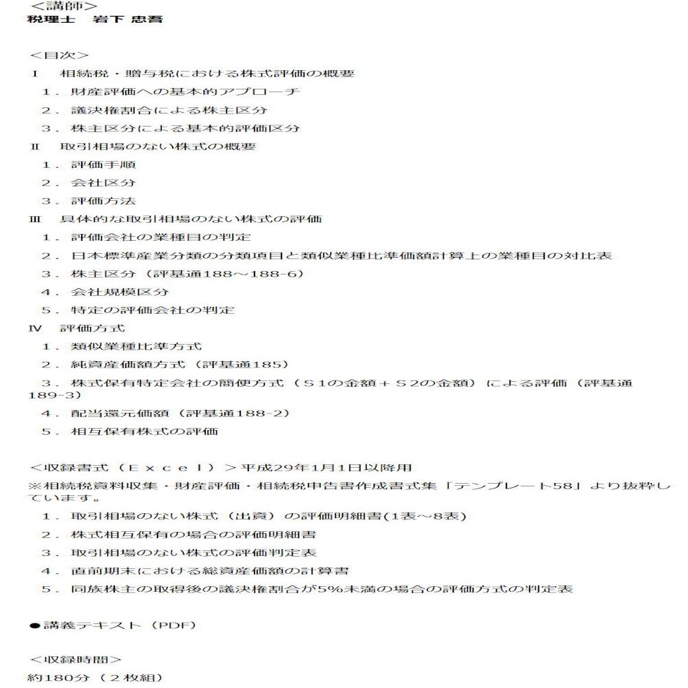講義映像とテキスト(PDF)をセット! 本商品では、取引相場のない株式の評価方法について、事例や評価明細書を用いて基礎から詳しく解説しています。また、実務に役立つ関連書式を「相続税資料収集・財産評価・相続税申告書作成書式集(テンプレート58)」より抜粋して収録しています。