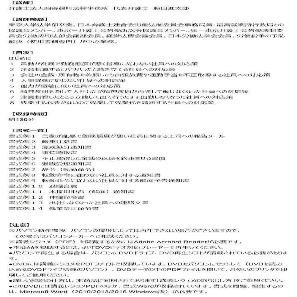 DVD 8つの事例と書式でわかる会社経営者を悩ます問題社員への対応策 V91 分かりやすく解説! 毎日のように会社経営者から相談を受け、問題社員への対応に当たっている弁護士が、実効性のある問題社員の対処法(ノウハウ)を公開。最近多い8つの困った社員の事例を挙げ、5W1Hの客観的事実を把握する事情聴収書などの14書式を使った具体的な対処法を解説します。