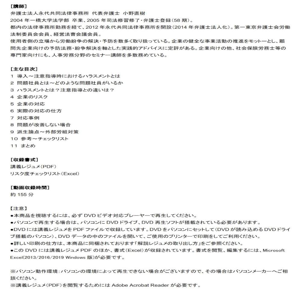 注意指導によって生じるハラスメント問題が急増中! また、実際の対応の仕方については、注意指導を行う前に準備することや問題社員への対応のトークスクリプト、そして、注意指導の記録の残し方についても盛り込んでいます。近年では、「パワハラ」と騒がれることをあまりにもおそれ、注意指導ができなくなり、問題社員が横行してしまうケースや、問題社員に煽られて感情的になり注意指導とは関係ないことを言ってしまい、状態が悪くなるケースがでてきています。そこで、本DVDでは、注意指導とパワハラの違いや、問題社員対応について、どのような点に留意し、接していけばよいのかを、タイプ別に解説しています。