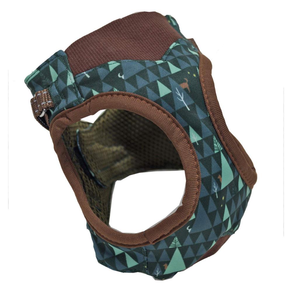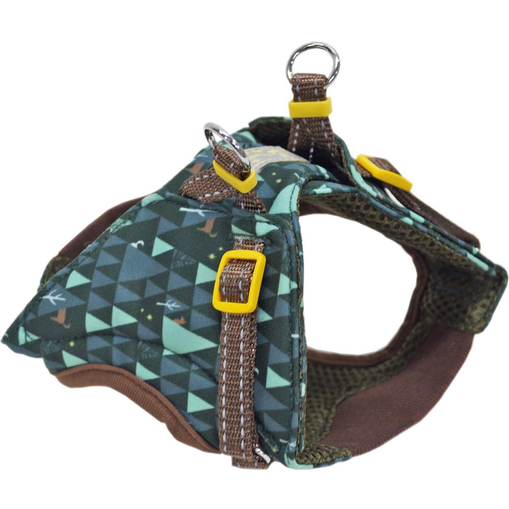 わんちゃんの体をやさしく包み込む、ソフトタイプのおしゃれなハーネス。胸元の伸縮生地で引張時の衝撃を吸収、内側はクッション性のあるメッシュ生地でムレにくく、やさしい肌ざわり。反射テープが夜道で光って安心・安全です。お散歩の中で出会うワクワクをテーマにかわいい雑貨風テキスタイル柄をデザインに取り入れています。足を通して背中のマジックテープでぴったりフィットの簡単装着。余端はすっきり収納。