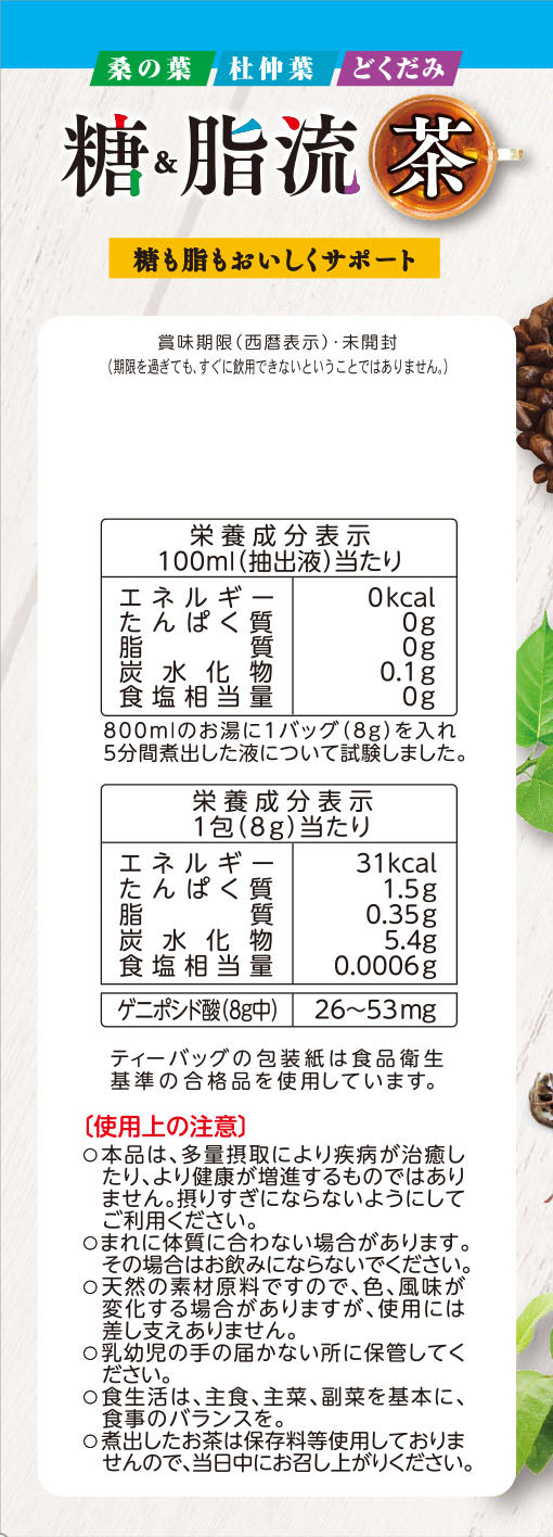 1バッグ中に「桑の葉の若葉(1800mg)」、「ゲニポシド酸を高含有した濃い杜仲葉(1700mg)」、そして「天然のどくだみ(600mg)」を使用して味と処方内容にこだわり仕上げました。