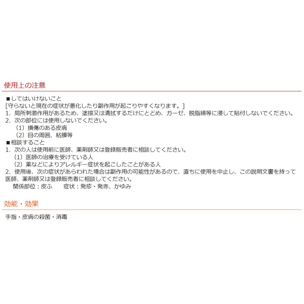 1.局所刺激作用があるため、塗擦又は清拭するだけにとどめ、ガーゼ、脱脂綿等に浸して貼付しないでください。