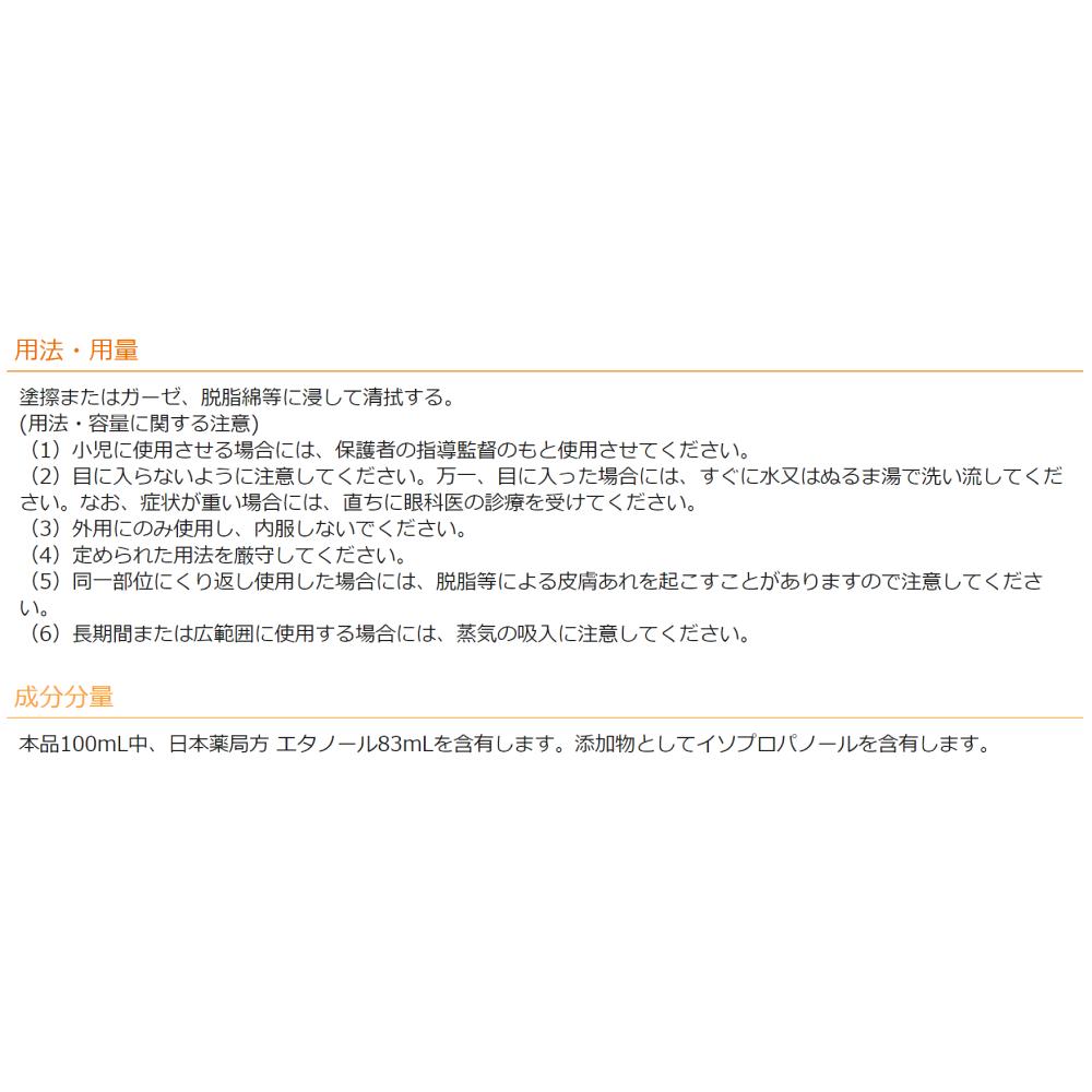 本品100mL中、日本薬局方 エタノール83mLを含有します。