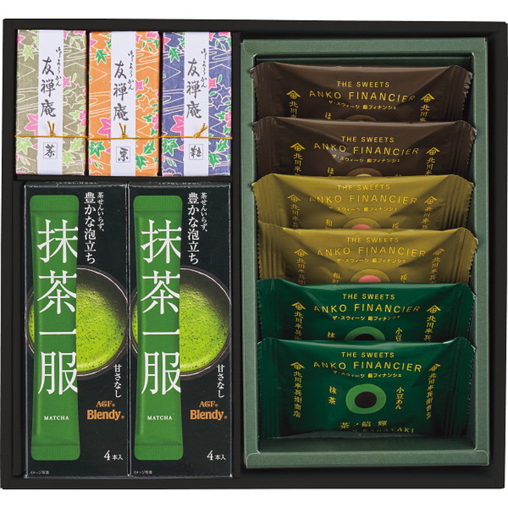 商品内容:●ブレンディ 抹茶一服 ミルクなし7.5g(4本入)×2、友禅庵(粒・栗・茶)×各1、餡フィナンシェ(抹茶×粒あん・ほうじ茶×白あん・和紅茶×桜あん)×各2