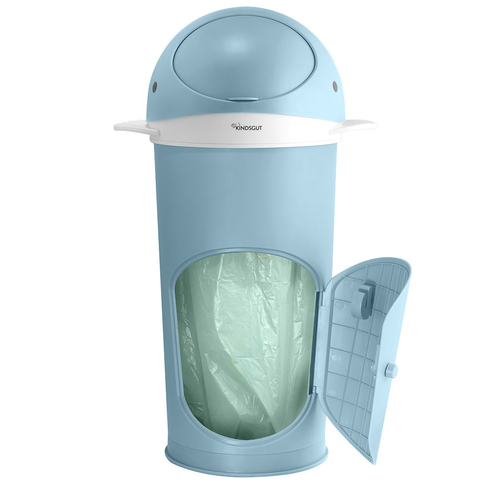 安全なスタンド・二重フラップ・袋交換も簡単。1回で約25~30個分のおむつが入ります。