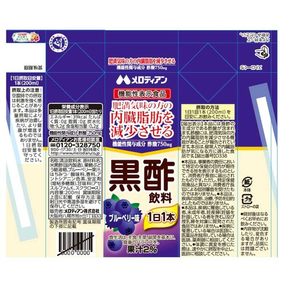 米黒酢(国内製造)、果糖ぶどう糖液糖、ブルーベリー果汁、はちみつ/酸味料、香料、アントシアニン色素、安定剤(増粘多糖類)、甘味料(アセスルファムK、スクラロース)